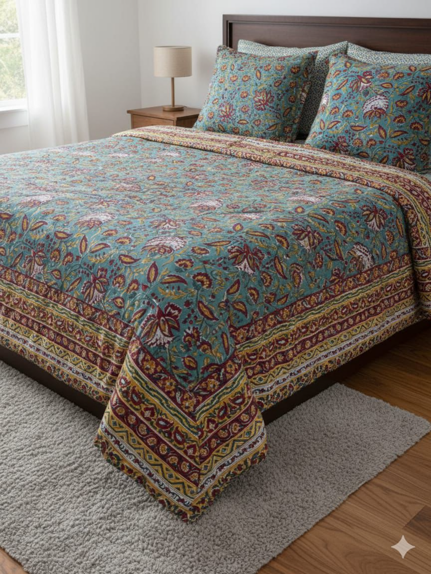 Teal Floral with Indigo Mosaic Hand Block Printed Cotton Suit with Dupatta